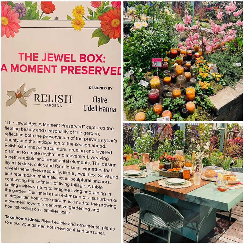 “The Jewel Box: A Moment Preserved,” described as “... captures the fleeting beauty and seasonality of the garden, reflecting both the preservation of the previous year’s bounty and the anticipation of the season ahead.” “Rivers of jars,” canning jars of preserves, flowed throughout the garden amongst ornamental and edible elements. This display garden illustrated a cohesive design for a suburban or metropolitan home.