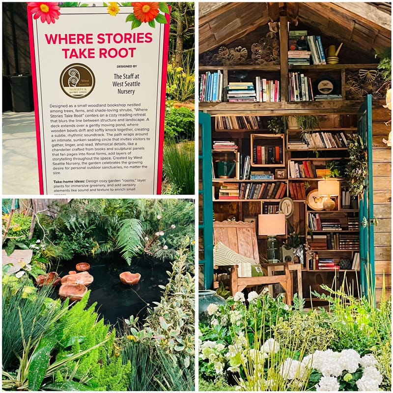“Where Stories Take Root,” designed by the staff at West Seattle Nursery, highlighted an outdoor library room nestled among trees, ferns, and shade-loving shrubs. The cozy reading retreat was illuminated by whimsical paper chandeliers crafted from books. An extremely artsy endeavor, it also invited visitors to gather, linger, and read in a sunken outdoor circular sitting area.
