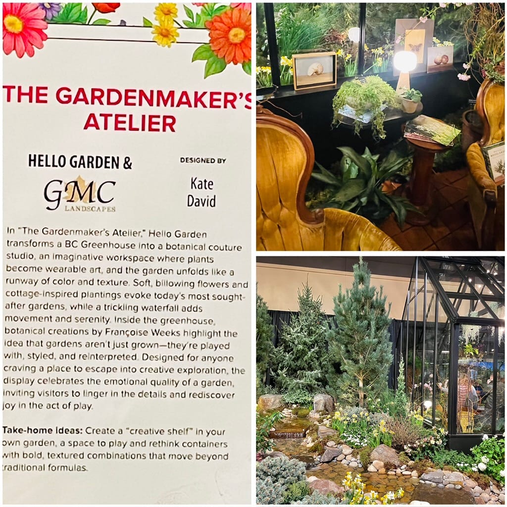 In “The Gardenmaker’s Atelier,” a modern BC greenhouse was transformed into an art studio where plants became wearable art. Surrounding the structure were flowers and cottage-inspired plantings. Inside the greenhouse, moss hung from the rafters, and botanical creations by Francoise Weeks showcased the creative act of play with items from the garden.