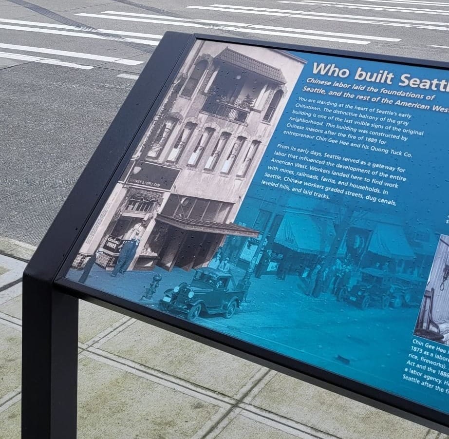 A sign on Second Avenue South Extension, near South Washington street, points to a darker side of Seattle history. The sign highlights a nearby building that was important in the Chinese community and the role Chinese workers played in building Seattle and the region.