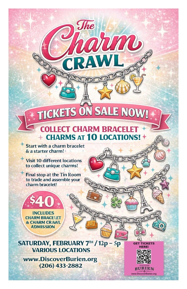 The Burien Charm Crawl will bring an innovative, self-guided, and interactive shopping experience to Downtown Burien on Saturday, February 7, from noon to 5:00 p.m. Participants are invited to explore local businesses while creating a custom charm bracelet.