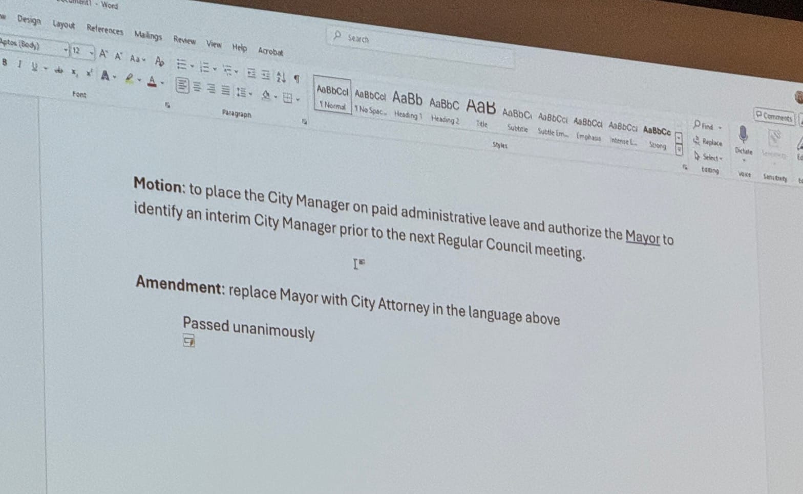 Councilmember Hugo Garcia made a motion to place Bailon on leave and put the mayor in charge of selecting the interim city manager. The motion was seconded by Councilmember Sam Mendez. Councilmember Kevin Schilling then proposed an amendment to instead direct the interim city attorney to select an interim city manager. That change was accepted by the full council.