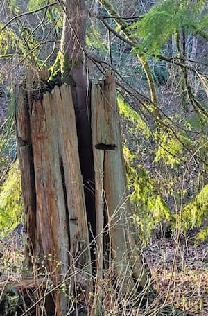 Dash Point State Park has two ecosystems. The first is the beach, which is wide, flat, and sandy with lots of sand dollars. This beach is very different from the rocky and narrow stretches of sand at Seahurst in Burien and other beaches on the east side of Puget Sound. The second ecosystem includes trails that cross streams and hills. On a recent visit to one of these woodland trails, I saw several tree stumps with distinctive notches. These massive trees were cut down by loggers who cut niches in the base of the tree to insert boards for standing while sawing. I can’t recall ever seeing these types of stumps in the Seattle area. The tree growing out of a stump is also quite distinctive; usually, nurse logs are much lower on the ground.