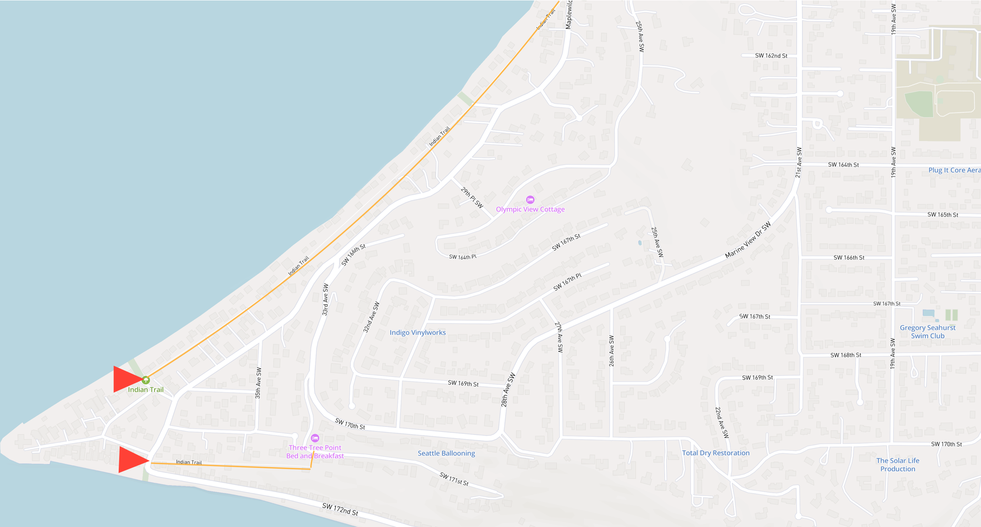 From Burien, head west on SW 152nd Street, which becomes Maplewild Avenue SW. Continue until you reach SW 170th Place; this marks the trailhead for the north section of the trail. Parking is available in a wide area on the south side of Maplewild. The southern portion of the trail begins just west of this spot, shortly before the road makes a sharp left near Three Tree Point.