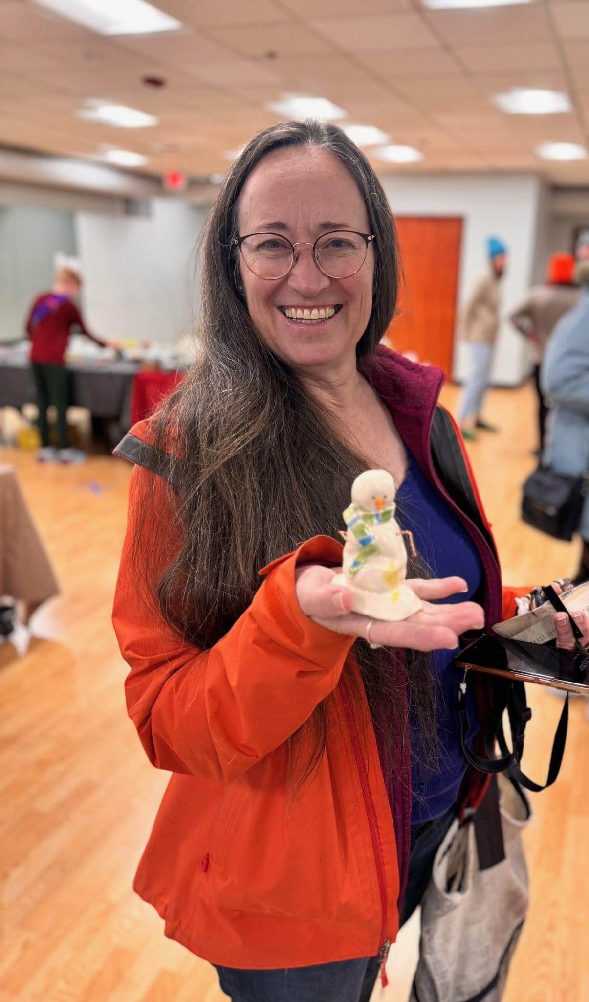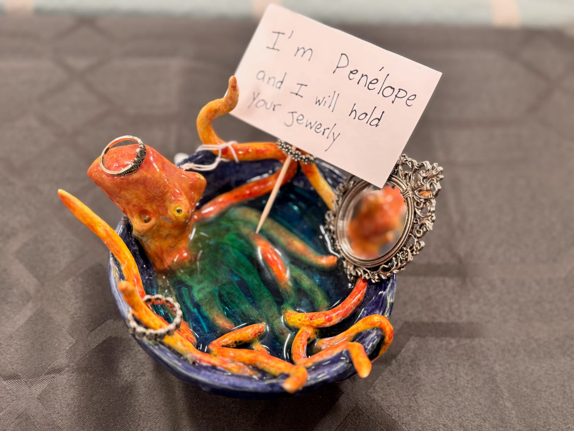 Daniel Del Riego is a visual arts teacher at Glacier Middle School and a volunteer at the Holiday Pottery Sale. Known for his contagious enthusiasm and holiday spirit, Del Riego showcased several ceramic pieces, including a whimsical favorite, “Penélope the Octopus,” a jewelry holder that quickly caught visitors’ attention.