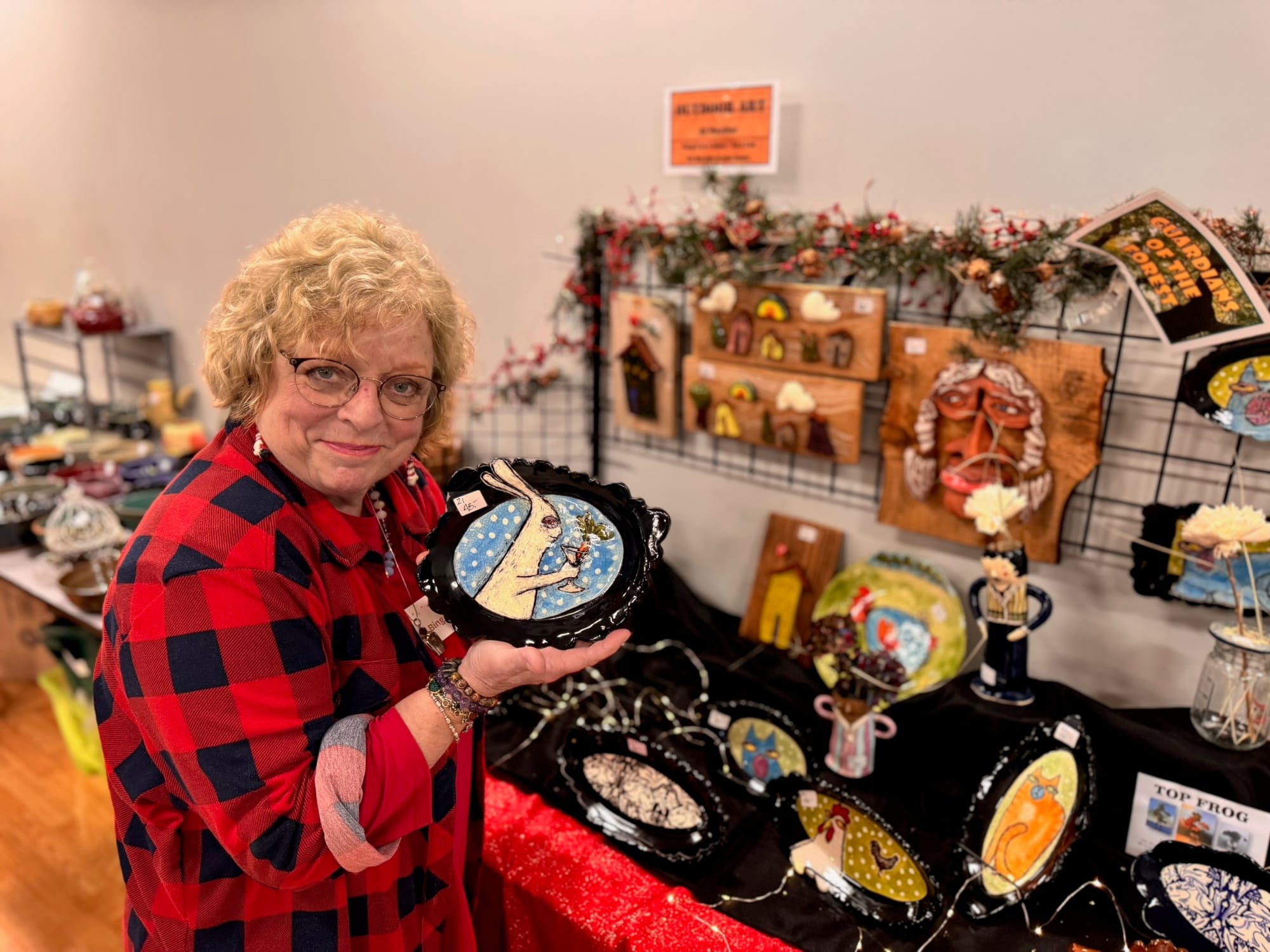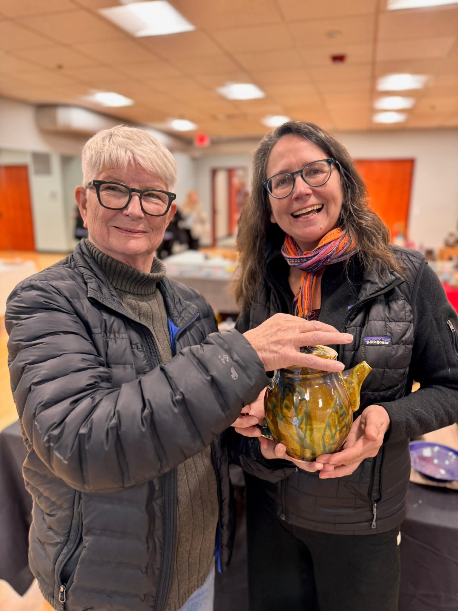 Alice Kay Lee, local ceramics artist and teacher, shows a favorite vase at the Moshier Holiday Pottery Sale on Dec. 6, 2025. Photo by Katie Kresly / The Highline Journal