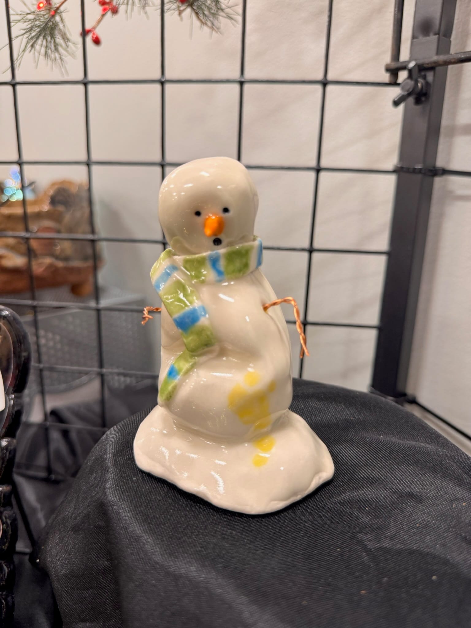 Her playful porcelain characters, fan favorites like “Uppity Chicken” and “Bad Rabbit,” bring humor and personality to her vibrant collection. During the sale, one lucky Burien shopper even snapped up her sassy “yellow snow” snowman.