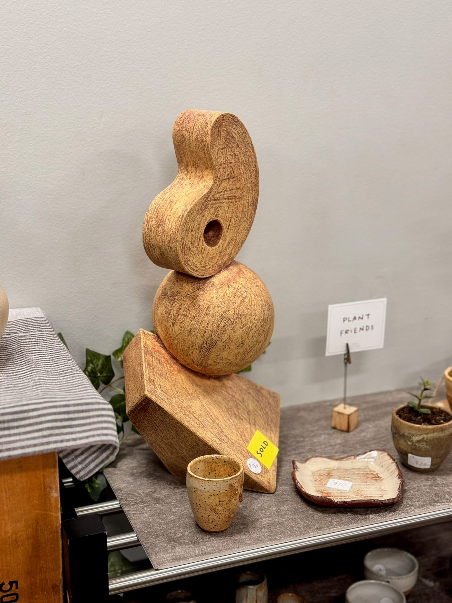 During the sale, attendees admired details in his work, including pine needles woven into ceramic forms. Hale continues his professional design work while describing ceramics as a joyful counterbalance, his opportunity to get away from the computer screen.