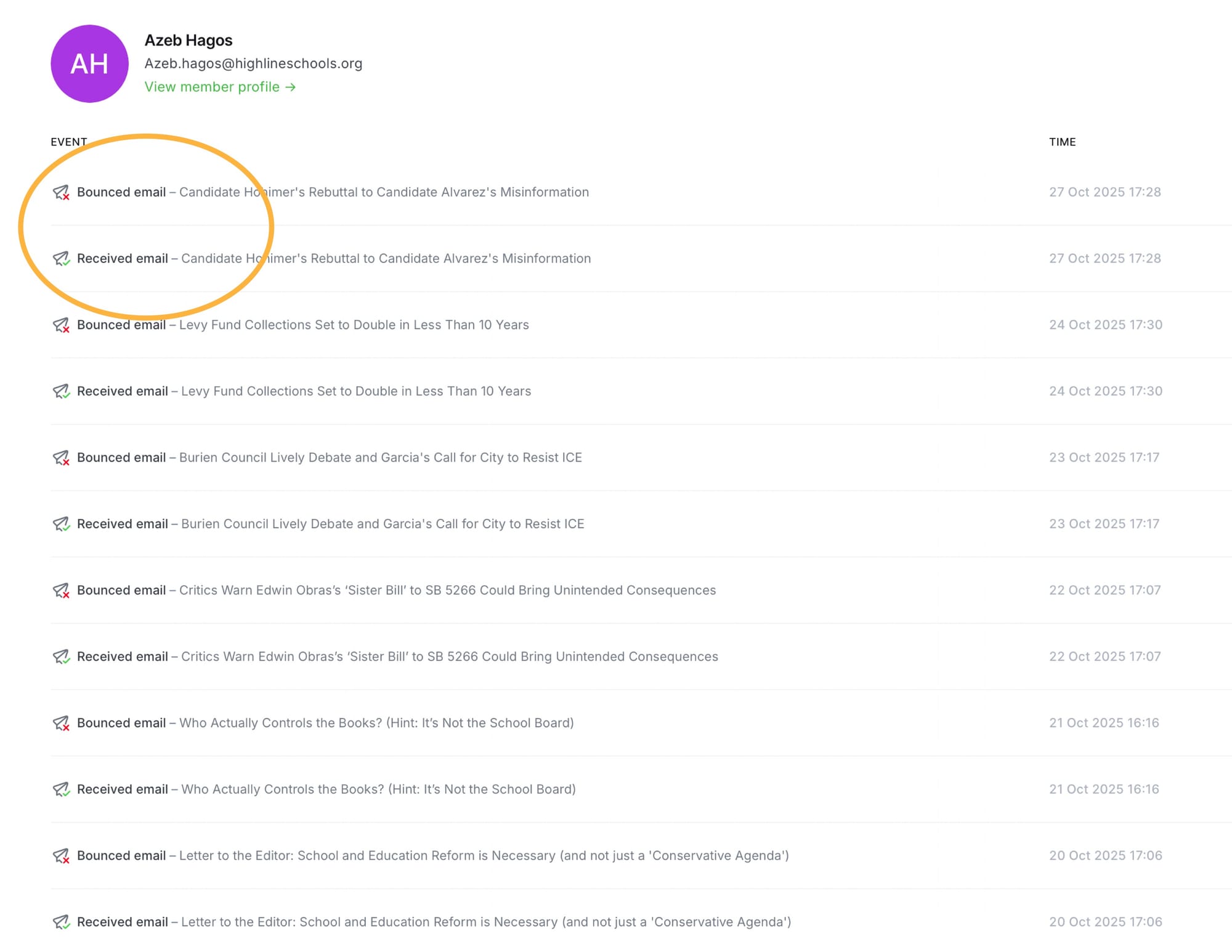 To make sure this was consistent, we looked at another ex-elected official subscriber of Azeb Hagos, and here is how her emails come back as "received" but repeated "bounced email".