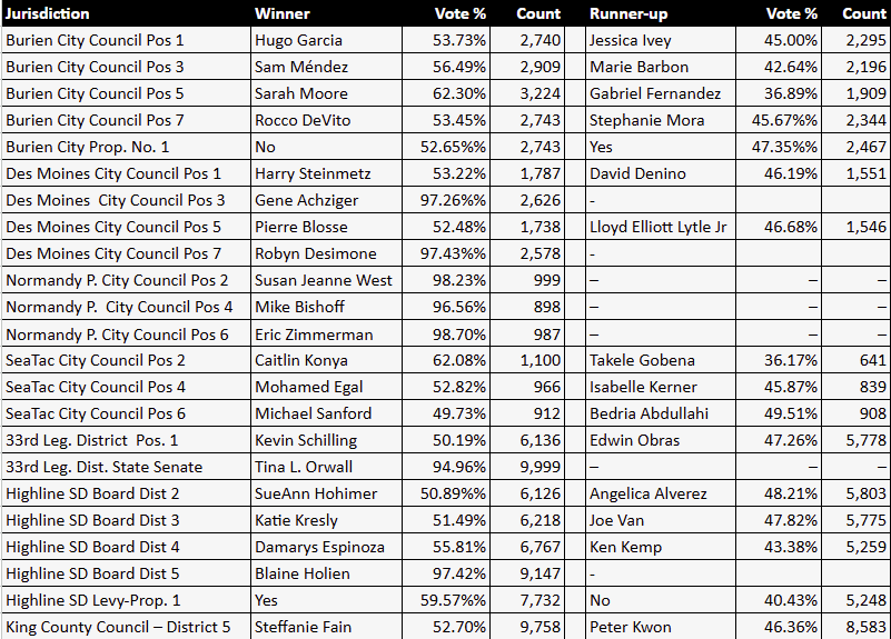 While ballots at the time of this publishing were only 20% counted by the end of Tuesday night, many candidates are waiting to see if daily drops of updated votes tallied on the King County Election website will change anything. Stay tuned for more updates.