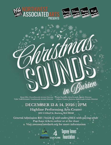 Experience Burien’s favorite holiday tradition! Gather your family and friends for an unforgettable celebration of music and community as the ensembles of Northwest Associated Arts — ChoralSounds, SilverSounds, TeenSounds, and KidSounds — bring the joy of the season to life.