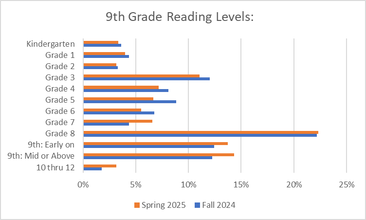 - In the Fall 2024 testing, 40% of ninth grade students tested at the Kindergarten through fifth grade level. The spring 2025 test had 35% test at K-5.