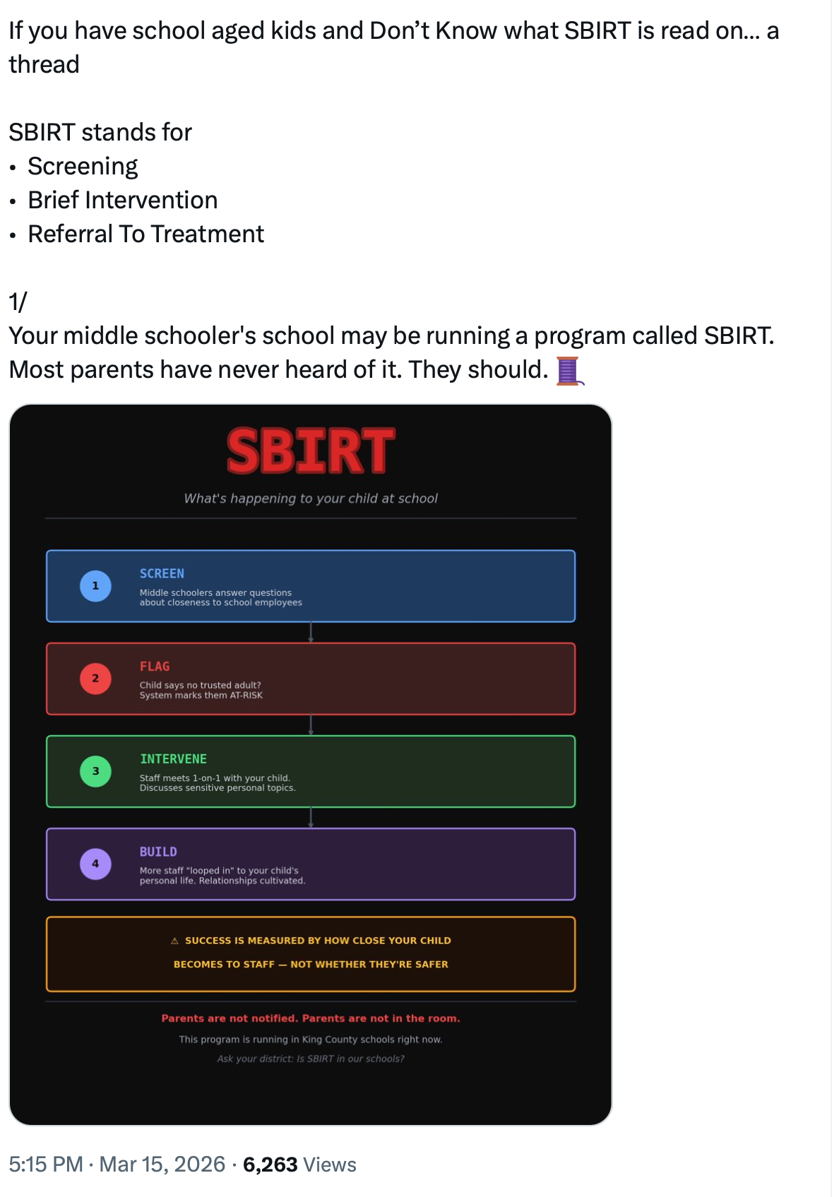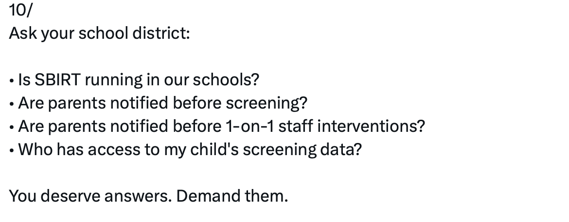 This post thread is from March 15, 2026, where Heywood outlines key aspects of these surveys, encouraging parents to ask questions of their district and schools about the use of the SBIRT surveys.