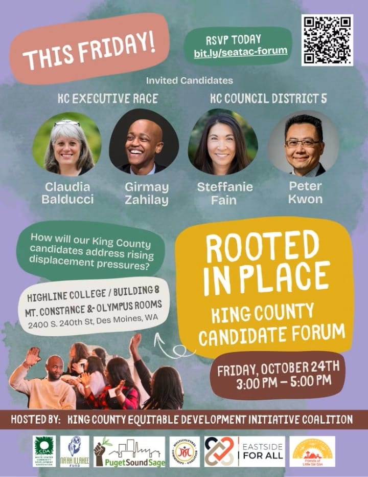 Candidates running for King County Executive and King County Council District 5 will join community members this Friday, Oct. 24, 2025, for a public forum focused on displacement and equitable development in South King County, according to Puget Sound Sage.
