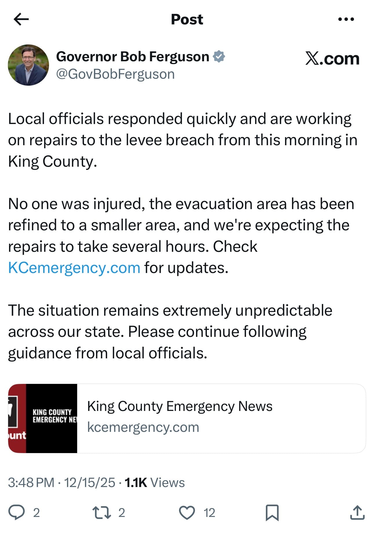 “King County and much of Washington state experienced severe and dangerous weather last week, resulting in historic flooding that has put lives, homes, businesses, and critical infrastructure at risk across our region. The risk of ongoing weather impacts remains high, with more rain and wind predicted over the next several days. Our county teams and first responders have been working tirelessly, from rescuing residents in danger to repairing roads and levees, to maintaining operations at critical wastewater facilities, and operating our emergency operations center in partnership with agencies across the county and state.