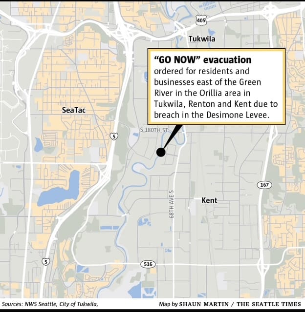 - A breach in the Desimone Levee created a GO NOW evacuation notice for residents and businesses east of the Green River in the Orillia area of Tukwila, Renton, and Kent.