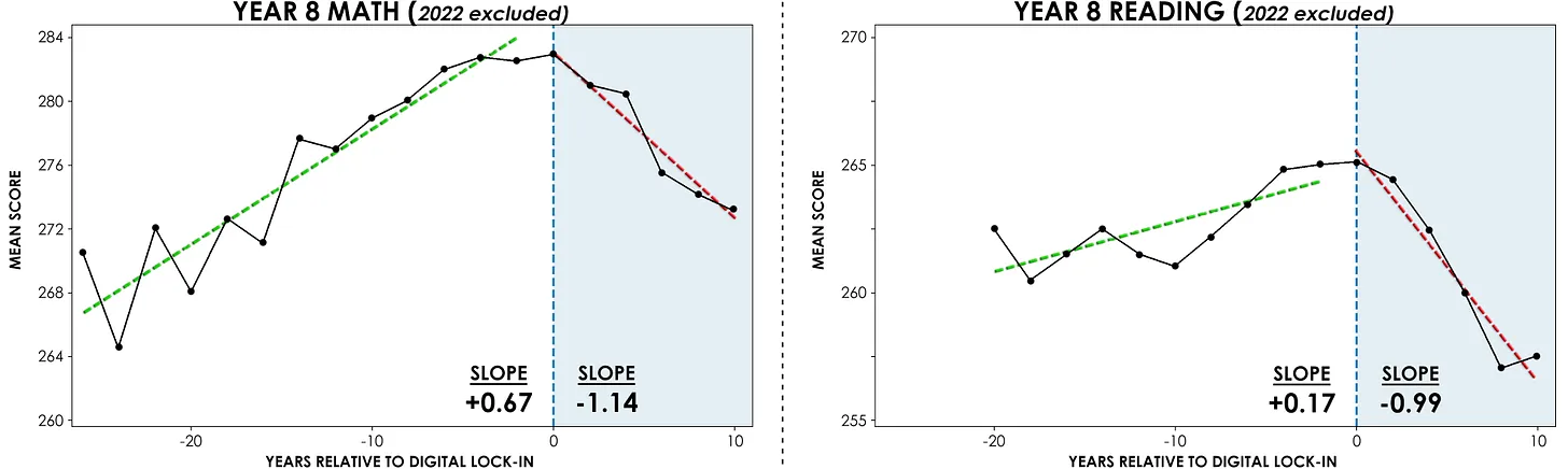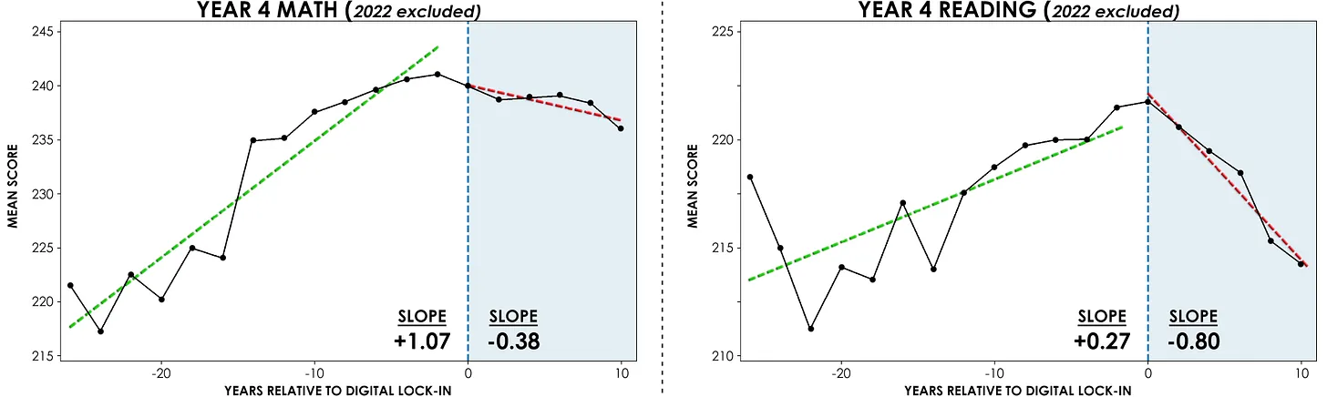 “Across state after state, scores in both 4th and 8th grade rose steadily… prior to large-scale digital adoption. After adoption… [they] shift — often sharply — toward decline.”