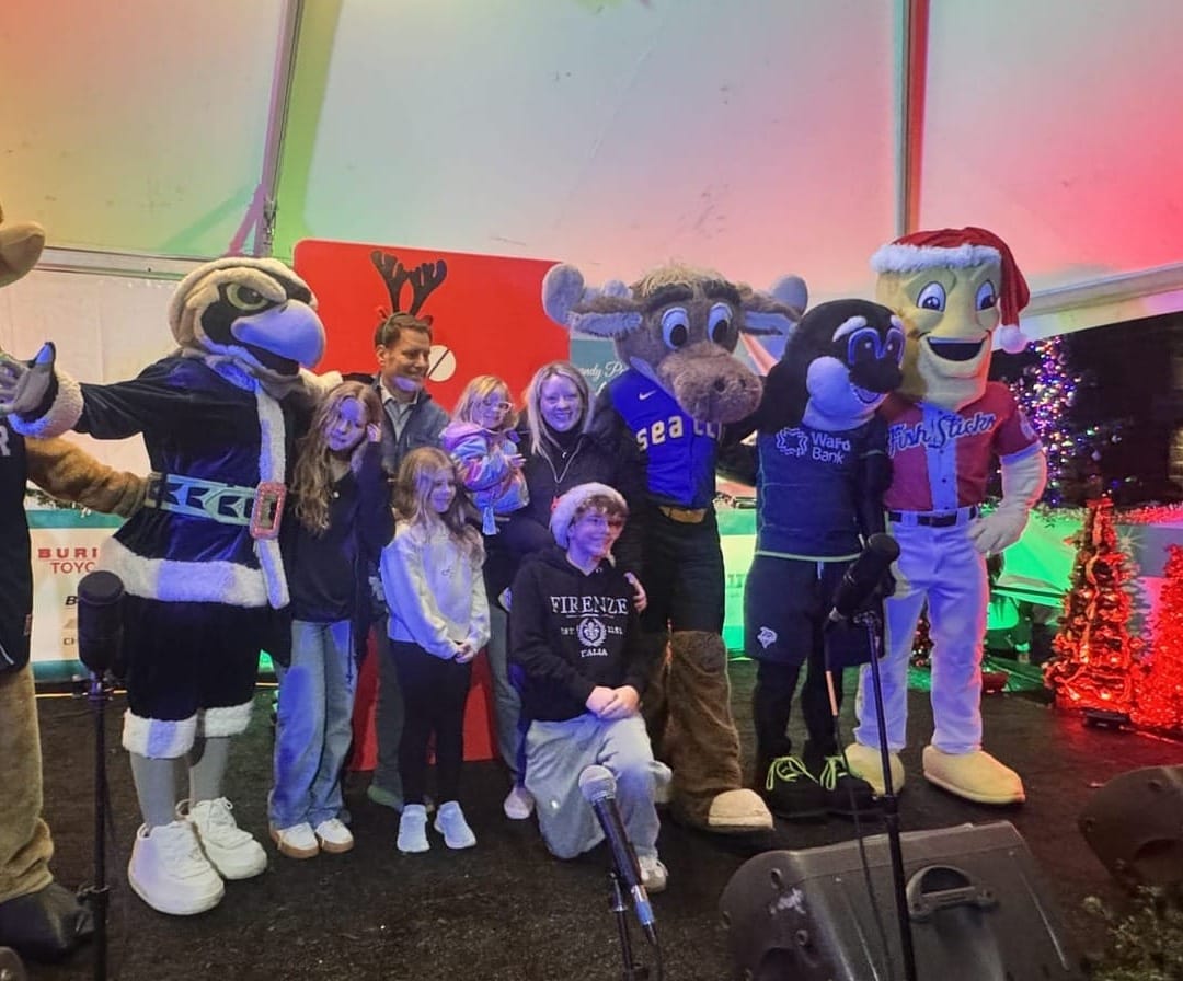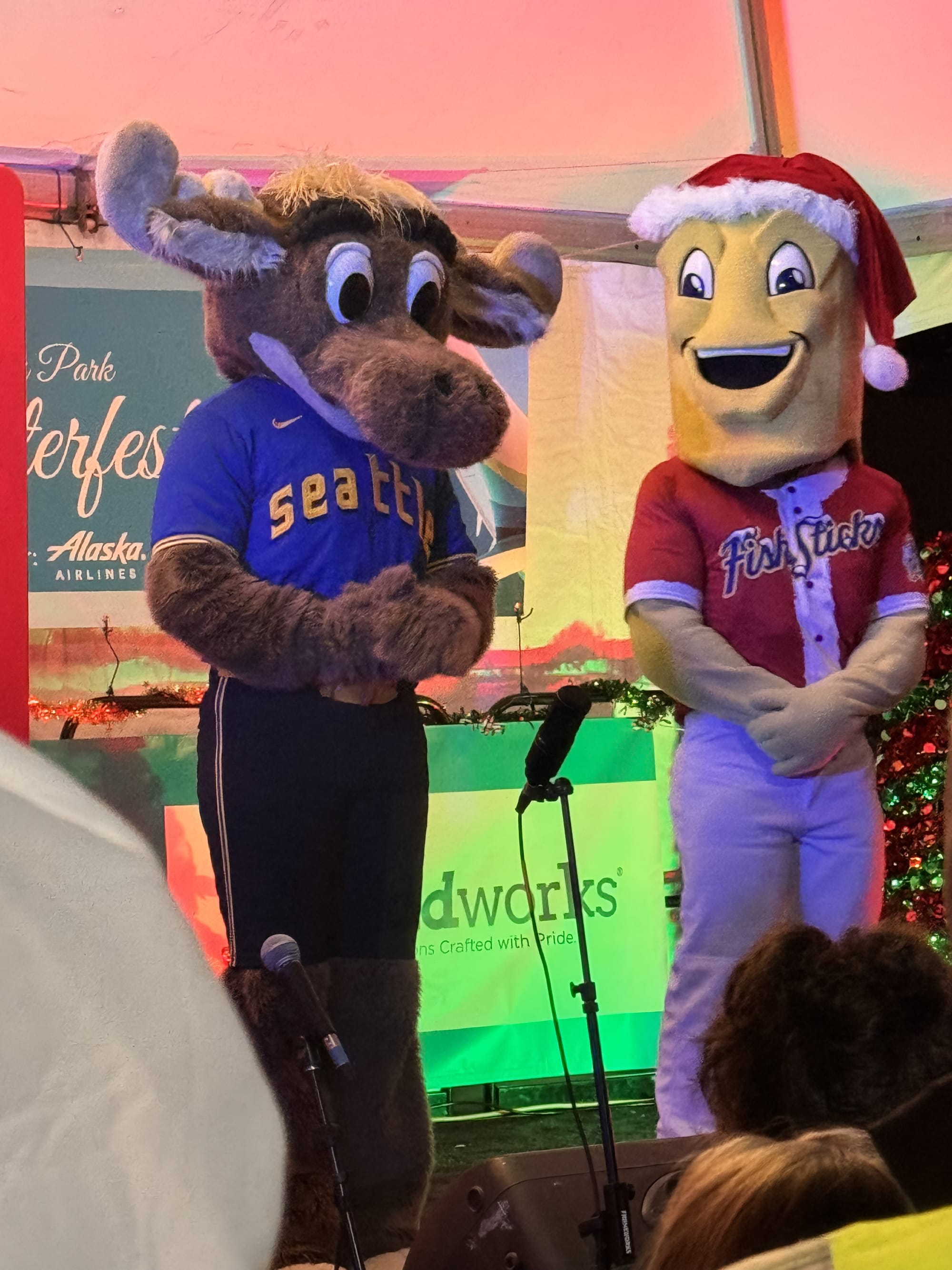 KOMO TV’s Stella Sun emceed the Christmas Tree Lighting Ceremony, joined by the Seattle Mariner Moose, Seahawks Blitz, Ivar’s Clam, and other special guests.