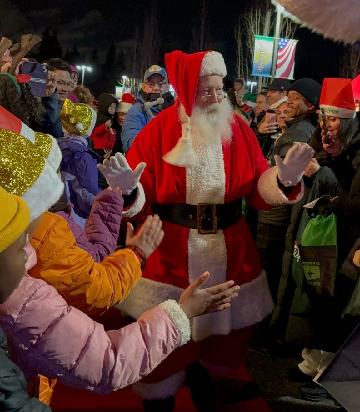 The VIP Family Experience honored the Petrini family of Normandy Park. Their youngest member, Pearl, delighted the crowd by flipping the new giant ceremonial light switch, illuminating the community Christmas tree just moments before Santa arrived in a dazzling motorcade. Normandy Park Mayor Eric Zimmerman helped welcome Santa and dignitaries to the stage.