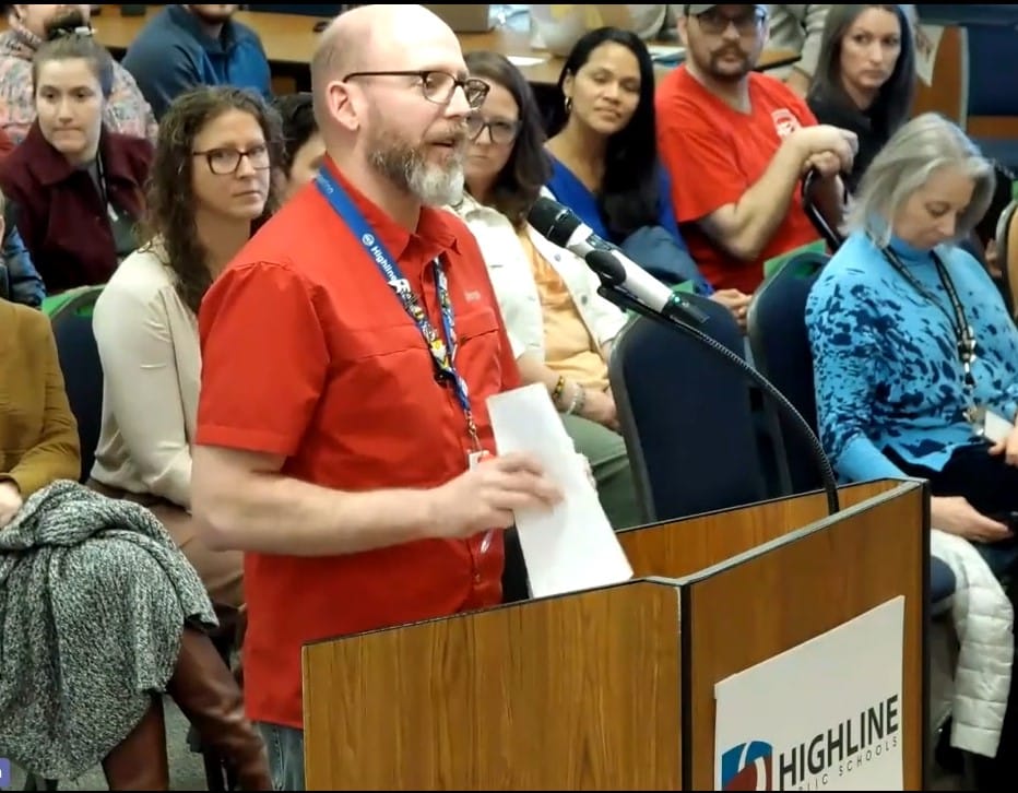 Before public comment began, Jeb Binn, President of the Highline Educators Association (HEA) spoke as a guest of the Superintendent. During his time, he spoke in support of student-designed and student-led walkouts protesting ICE and the treatment of immigrants in our community.