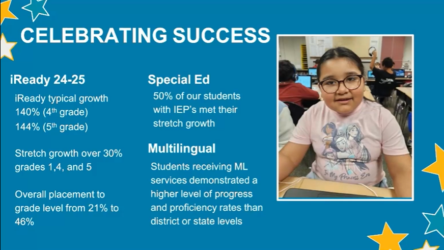 Presentation included statistics on Bilingual Fluency and iReady growth: