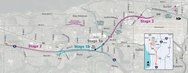 The SR 509 Completion Project is building three miles of new tolled highway connecting I-5 to South 188th Street near the south end of Seattle-Tacoma International Airport. Construction is being delivered in stages: